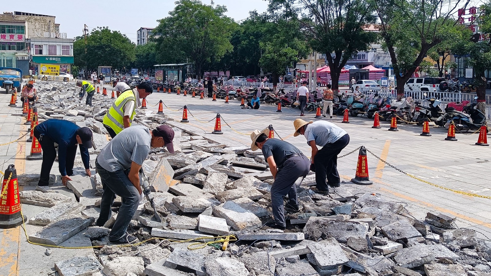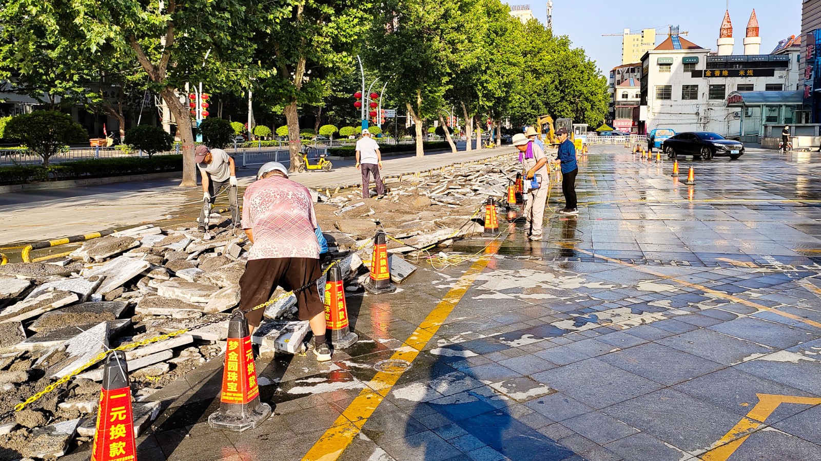 宇龍廣場地面停車場為石材路面,每次雨季,雨水滲入地下,下層砂石層土質(zhì)疏松,加上車流量過大,導(dǎo)致路面石材經(jīng)常松動,坑洼不平,既不美觀又存在嚴重的安全隱患。反復(fù)維修路面石材治標不治本,且影響車輛通行,針對此問題,物業(yè)部經(jīng)過多次外出考察學(xué)習(xí)和對比詢價,自2022年6月9日起開始施工改造。