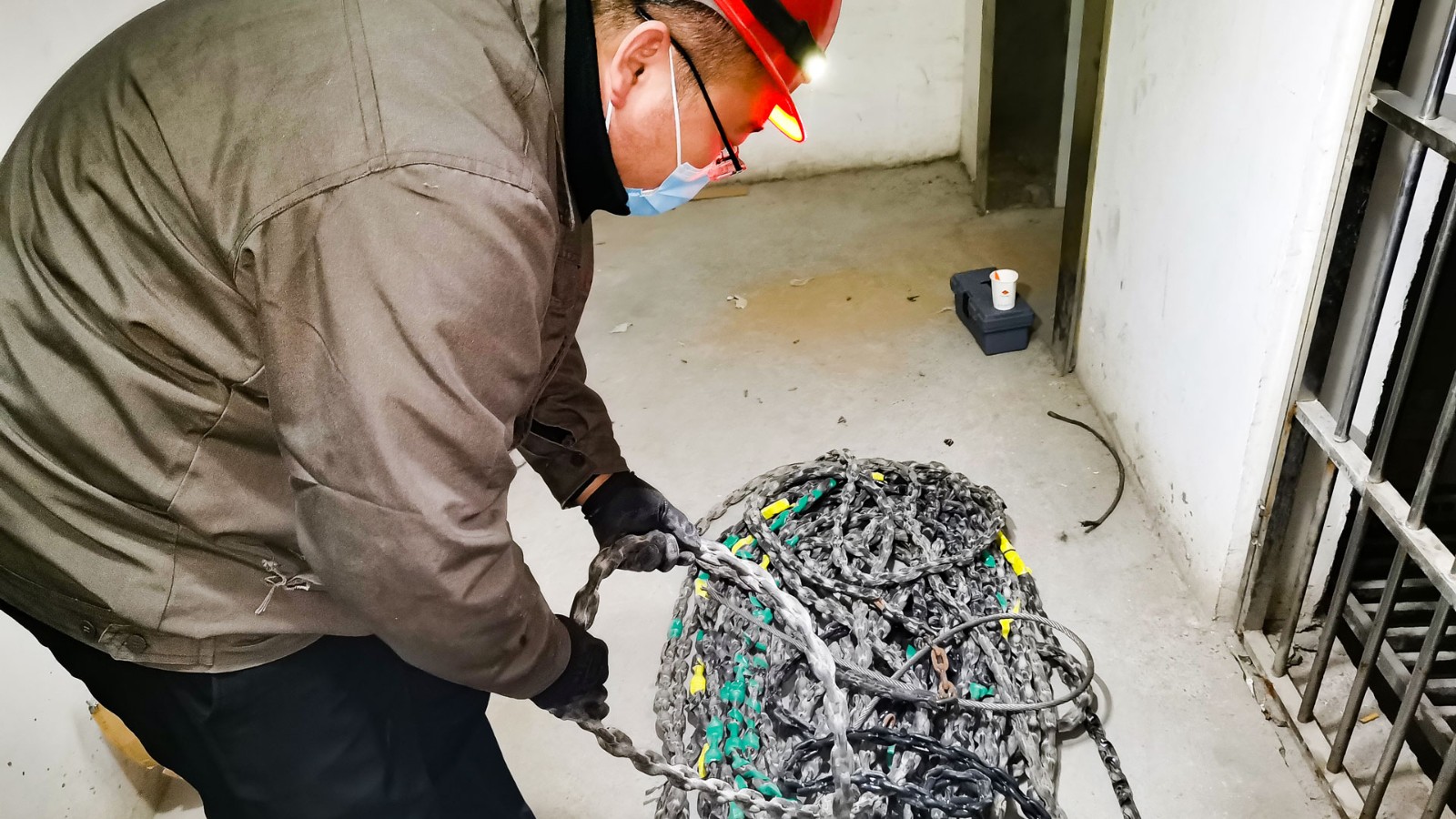 3月26日上午,待電梯配件到貨后,維保班組一行人員到達(dá)一期8號樓便著手進(jìn)行更換。維保人員分工明確,配合默契,一人在轎頂操控電梯運行,另外兩人在做好各項安全防護(hù)工作后進(jìn)入電梯底坑。經(jīng)過近一天的不懈努力,將兩條近百米長的補(bǔ)償鏈全部更換完畢。之后經(jīng)過反復(fù)試驗,電梯運行時已無異響。