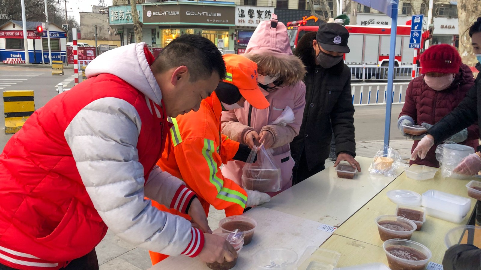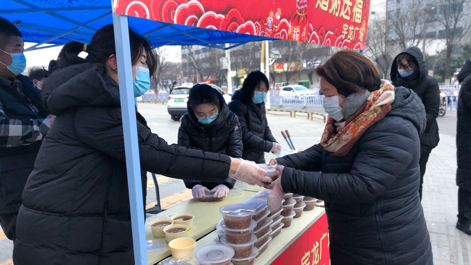 由于疫情防控的需要,為了防止人員聚集,工作人員提前把粥用餐盒打包好,寒風(fēng)中工作人員熱情地招呼過往行人品嘗一碗香暖四溢的臘八粥,讓大家能夠在寒冷的冬季感受到宇龍廣場的溫暖。與此同時,楚總帶領(lǐng)工作人員將一碗又一碗的臘八粥送到附近執(zhí)勤的交警、環(huán)衛(wèi)工人手中,向冒著嚴(yán)寒的工作者表示慰問和感謝,讓他們一同感受越來越近的年味,感受來自宇龍廣場的關(guān)愛。