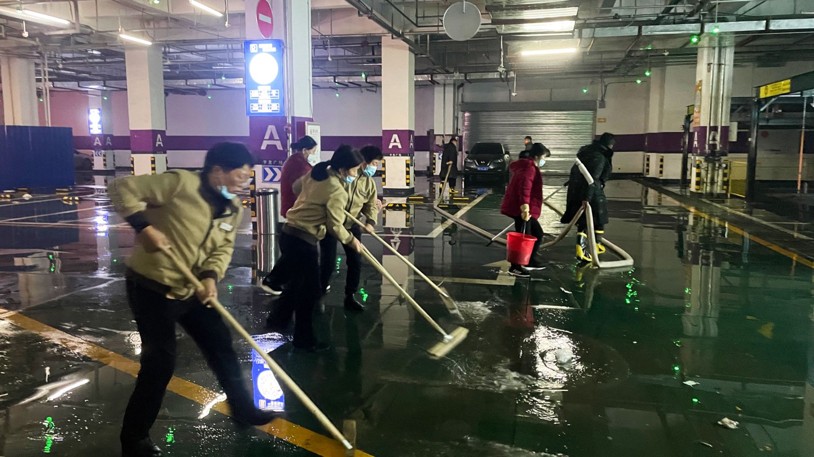 連續(xù)幾天的降雪,使廣場負二停車場的地面堆積了大面積的泥垢。為給廣大顧客和業(yè)主營造一個干凈、舒心的停車環(huán)境,1月30日早上,應(yīng)商貿(mào)公司執(zhí)行董事胡總要求,綜合部牽頭,公司各部門共同對負二停車場開展了全方位的衛(wèi)生大掃除。